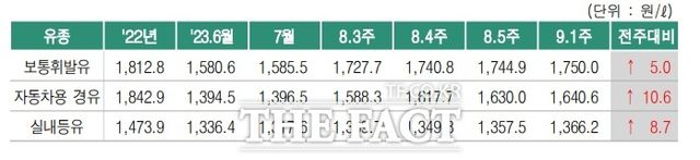 정부는 그동안 유류세 인하 조치로 상승 폭을 어느 정도 억제해왔는데 10월이면 인하 조치가 끝난다. 정부는 올 들어 휘발유 감세 폭을 37%에서 25%로, 감세액을 304원에서 205원으로 낮췄다. 경유(212원), LP가스·부탄(73원)은 지난해 하반기와 같은 수준의 감세(37% 인하)를 4월까지 하기로 했는데 4월이 되자 8월까지 연장했고, 8월에는 10월까지 더 연장이 이뤄졌다.