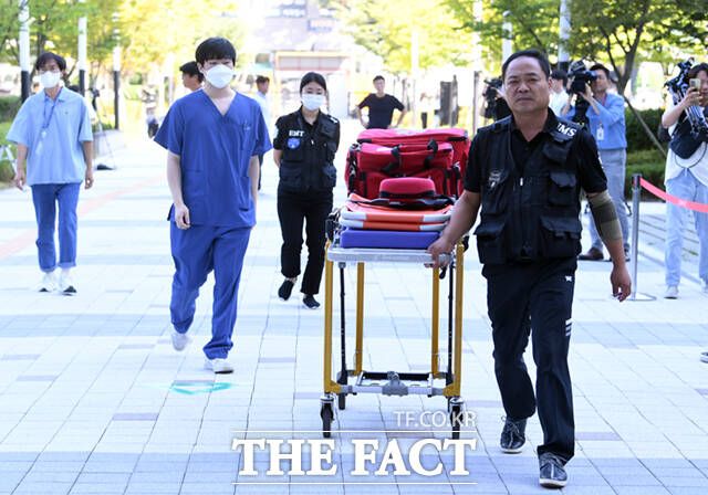 의료진과 이동침대가 검찰청사에 들어서고 있다.