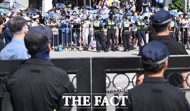 무기한 단식 중인 이 대표의 검찰 출석을 앞두고, 만일을 대비해 구급차와 의료진이 청사에 도착해 있다.