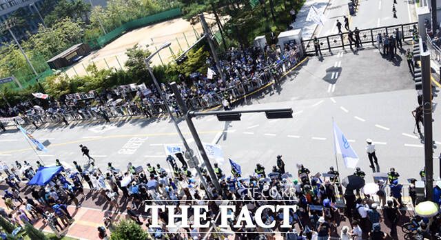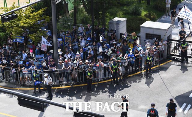 지지자들이 수원지방검찰청 앞에 모여 집회를 하고 있다.