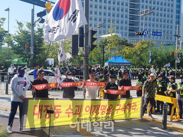 보수단체 회원들의 이같은 발언에 이재명 대표 지지자들은 확성기와 부부젤라 등을 이용해 발언을 방해했고 보수단체측도 이에 맞대응하며 소란은 계속됐다.