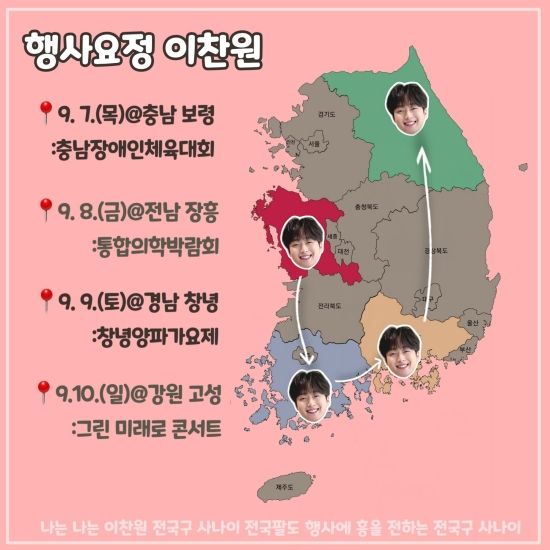 이찬원은 이달 7일부터 10일까지 나흘동안 충청도, 전라도, 경상도, 강원도에서 각각 행사 무대를 펼치며 '행사요정'다운 행보를 보인 바 있다.