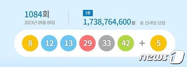 지난 9일 추첨한 제1084회 로또 1등 당첨 번호는 '8·12·13·29·33·42'로 결정됐다. 보너스 번호는 '5'다.