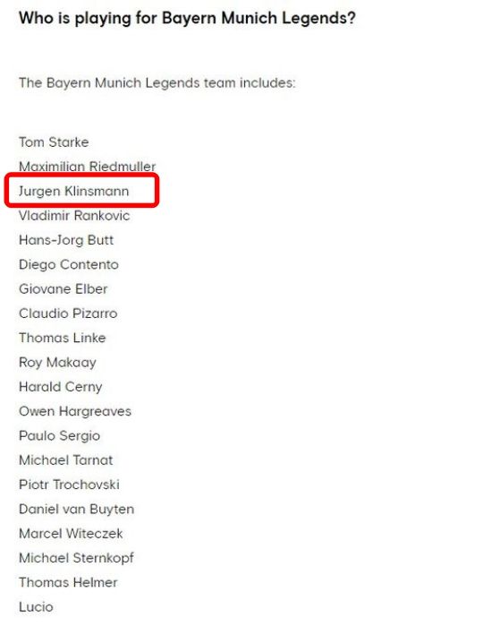 클린스만은 톰 슈타르케, 디에구 콘텐토, 지오바니 에우베르, 클라우디오 피사로, 로이 마카이, 오언 하그리브스, 토마스 헬메르, 루시우 등 뮌헨 레전드들과 함께 명단에 올랐다.