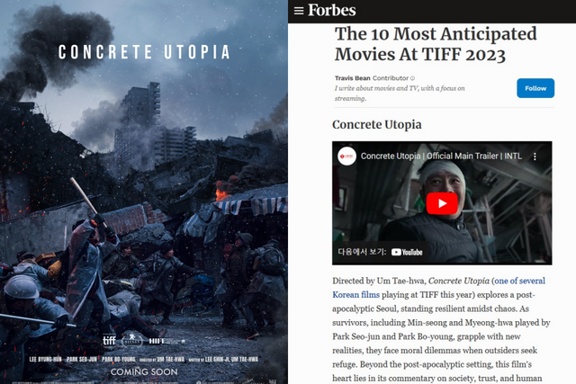 영화 ‘콘크리트 유토피아’가 미국 매체 포브스(Forbes)의 ‘2023 토론토 국제영화제에서 가장 기대되는 작품’ 하나로 선정되어 화제이다.
