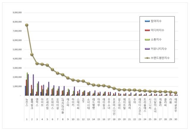 9월 걸그룹 브랜드평판 순위는 뉴진스→블랙핑크→엔믹스 뒤를 이어 아이브, 르세라핌, 트와이스, 오마이걸, (여자)아이들, 에스파, 하이키, 스테이씨, ITZY, 소녀시대, 레드벨벳, 마마무, 에이핑크, 우주소녀, 프로미스나인, 걸스데이, 에이프릴, 드림캐쳐, 우아, 레이디스코드, 트리플에스, 시그니처, 이달의 소녀, 케플러, 클라씨 , 라붐, 에버글로우가 30위까지 올랐다.
