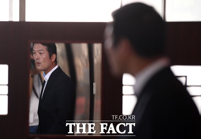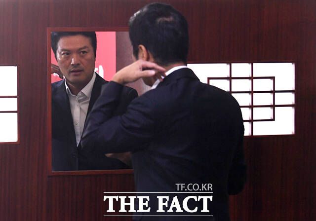 김태우 전 서울 강서구청장이 10일 오전 서울 여의도 국회를 찾아 강서구청장 보궐선거 공천을 위한 후보자 추천신청을 마친 뒤 기자회견에 앞서 거울을 보며 용모를 점검하고 있다. /국회=이새롬 기자
