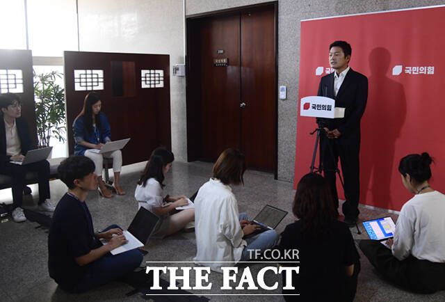 [더팩트ㅣ국회=이새롬 기자] 김태우 전 서울 강서구청장이 10일 오전 서울 여의도 국회를 찾아 강서구청장 보궐선거 공천을 위한 후보자 추천 신청을 마친 뒤 기자회견을 하고 있다.