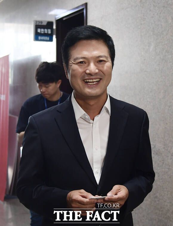 김태우 전 서울 강서구청장이 10일 오전 서울 여의도 국회를 찾아 강서구청장 보궐선거 공천을 위한 후보자 추천신청을 마친 뒤 기념촬영하고 있다.