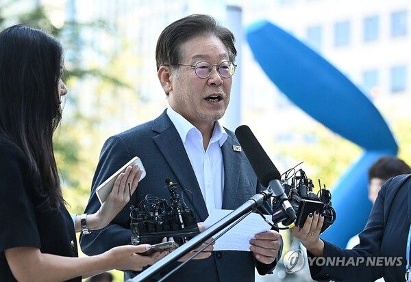 이날 오전 10시 20분 수원지검에 출석한 이 대표는 지난 대선 이후 다섯 번째 검찰 포토라인 앞에 섰다. 그는 미리 준비한 A4용지 1쪽 짜리 입장문을 낭독하며 "국민을 두려워하지 않는 정권은 반드시 심판받았다는 것이 역사이고, 진리"라며 "국정 방향을 전면 전환하고 내각 총사퇴로 국정을 쇄신해야 한다"고 윤석열 정권을 겨냥했다.