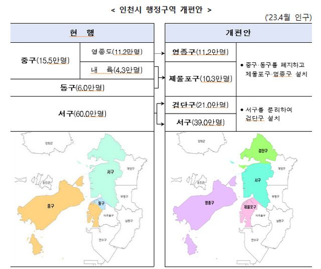 법률안은 △중구 내륙 지역과 동구를 관할하는 제물포구 설치 △중구 영종도 지역을 관할하는 영종구 설치 △서구 아라뱃길 북쪽을 관할하는 검단구 설치 등을 담고 있다.