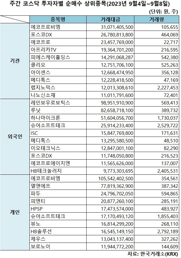 기관 '에코프로비엠'·외인 '레인보우로보틱스'·개인 '에코프로비엠' 1위 [주간 코스닥 순매수- 9월4일~9월8일]