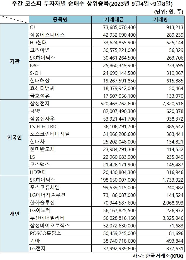 기관 'CJ'·외인 '삼성전자'·개인 'SK하이닉스' 1위 [주간 코스피 순매수- 9월4일~9월8일]