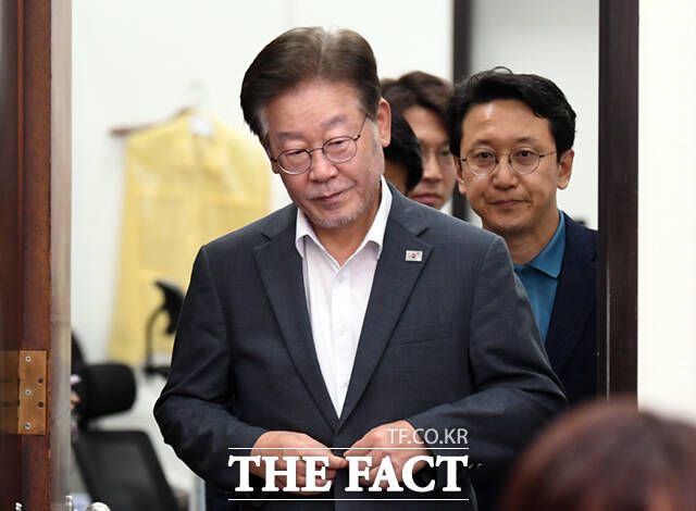 [더팩트ㅣ국회=이새롬 기자] 단식 11일째인 이재명 더불어민주당 대표가 10일 오전 서울 여의도 국회 당대표회의실에서 열린 교원회복을 위한 교원단체 간담회에 참석하는 가운데, 수행비서가 이 대표의 태극기 배지를 고쳐잡고 있다.