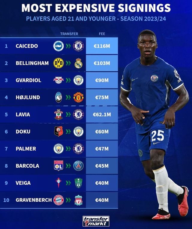 1위는 모이세스 카이세도였다. 카이세도는 브라이튼에서 성장해 PL 최고 미드필더가 됐고 이적료 1억 1,600만 유로(약 1,658억 원)를 기록하면서 첼시로 입성했다. 카이세도는 높은 이적료만큼 기대가 컸는데 현재까지는 고개를 갸우뚱하게 하고 있다.