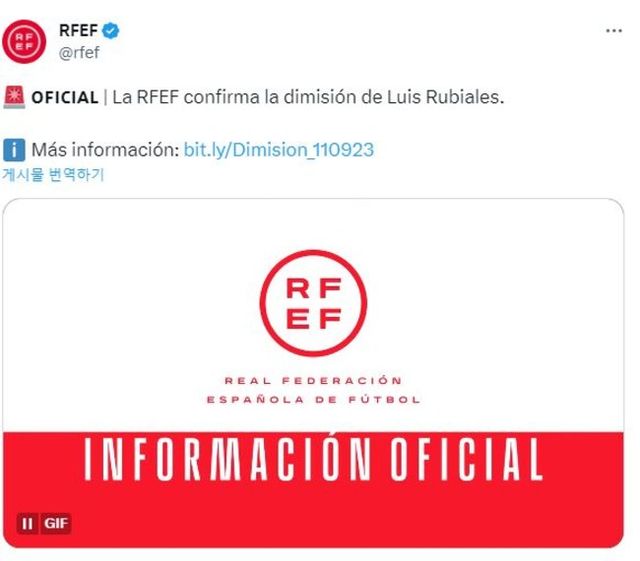 스페인축구협회는 11일(이하 한국시간) 공식 홈페이지를 통해 “우리는 루비알레스가 사퇴했다는 점을 확인했다. 페드로 로샤 준코 스페인축구협회 부회장에게 보낸 편지를 통해 연맹에 사퇴가 알려졌다. 아울러 그는 유럽축구연맹(UEFA) 부회장직도 사퇴했다, 그의 사퇴로 현행 연방 법령에 설명된 절차가 시작될 것”이라고 공식적으로 발표했다.