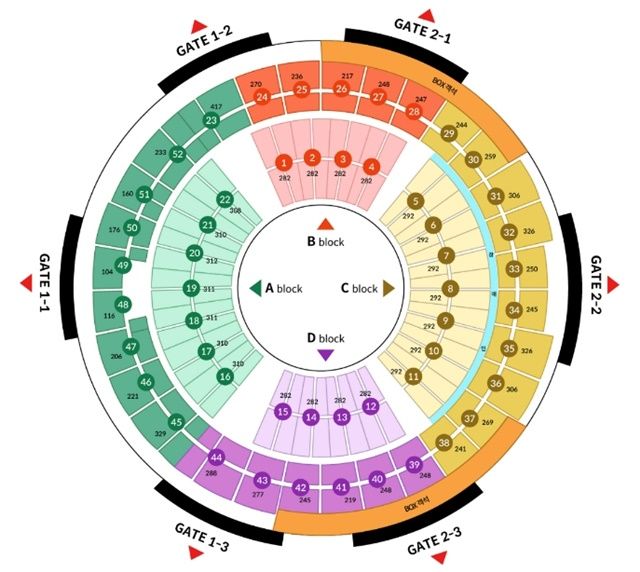 서울 공연 예매 일정이 사흘 앞으로 다가선 가운데 '티켓 경쟁'은 더욱 치열할 것으로 보인다. 지난해 임영웅의 전국투어 관람권은 예매 오픈과 동시에 매회 전석 매진됐다. 서울 KSPO DOME 콘서트 자리배치도. /물고기 뮤직