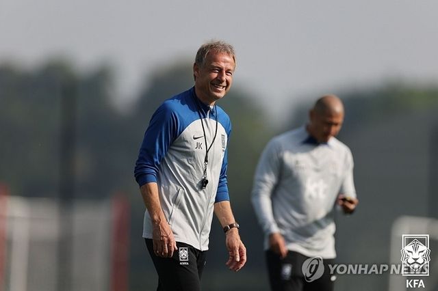 위르겐 클린스만 감독이 사우디아라비아와의 친선 경기를 앞둔 10일(현지 시각) 영국 런던 브렌트포드FC 훈련장에서 훈련지시 도중 미소를 보이고 있다. / 연합뉴스
