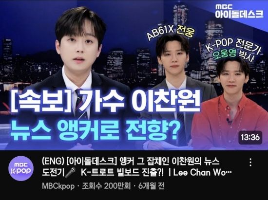 지난 3월 MBC K-POP 유튜브 채널에는 "(ENG) [아이돌데스크] 앵커 그 잡채인 이찬원의 뉴스 도전기 K-트로트 빌보드 진출?! | Lee Chan Won | MBC KPOP ORIGINAL"라는 제목의 영상이 게재됐다.