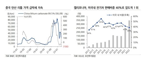 리튬 가격은 배터리 가격 변동의 가장 큰 변수이다. 탄산리튬 가격은 2020년 5천달러/톤을 저점으로 상승하기 시작해서 2021년말 4만달러를 돌파했다. 2022년 12월까지 8만달러를 상회한 뒤 하락하기 시작했고, 현재 2.7만달러 수준이다. 리튬 수요의 50% 이상을 차지하는 중국의 리튬 업체들이 급증하는 배터리 업체들의 설비 증설에 근거한 확장을 했기 때문이다. 중국의 전기차 판매 성장률이 2021년 153%, 2022 년 84%를 구가할 때는 부담이 되지 않던 리튬 증설물량이 전기차 판매 성장률이 낮아지면서 부메랑으로 돌아온 것이다.