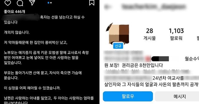 11일 한 인스타그램 계정에 '24년 차 여교사를 자살하게 만든 살인자와 그 자식들의 얼굴과 사돈의 팔촌까지 공개합니다'라는 글이 올라왔다.