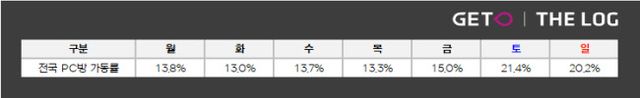 9월 1주 전국 PC방 총 사용시간은 약 1천 746만 시간으로 전주 대비 5.1% 감소, 전월 대비 9.3% 감소, 전년 대비 10.8% 감소한 수치이다. PC방 주간 가동률은 평일 평균 13.8%, 주말 평균 20.8%로 주간 평균 15.8%를 기록했다.