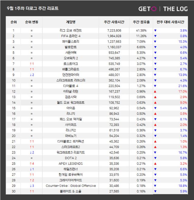 전국 PC방 주간 사용시간이 감소하며 TOP 5 순위 게임들도 전주 대비 사용시간이 소폭 감소했다. 3위에 랭크된 '메이플스토리'가 전주 대비 사용시간이 15.3% 감소하여 가장 큰 폭으로 감소했고, 2위에 랭크된 'FIFA 온라인 4'는 0.8% 감소하여 가장 적은 폭으로 감소했다.