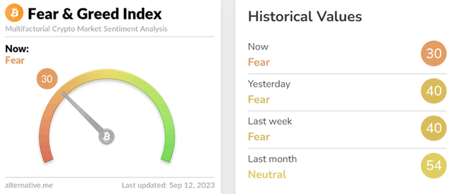 이날 암호화폐 데이터 제공 업체 알터너티브(Alternative)의 자체 추산 '공포·탐욕 지수'는 전날 대비 10포인트 내린 30을 기록하며 투심이 크게 위축됐다. 다만 '공포' 단계는 유지됐다.