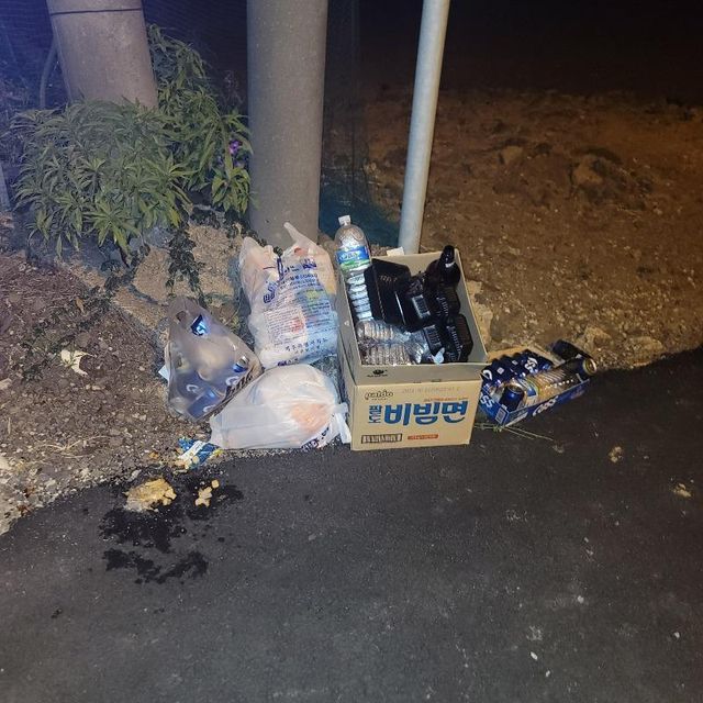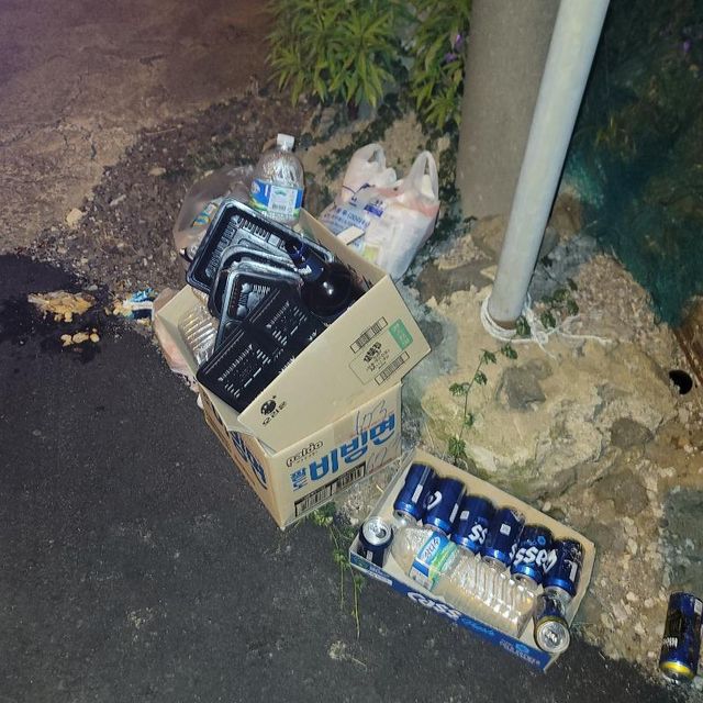 사진을 보면 B씨는 종량제 봉투와 함께 페트병, 플라스틱 용기 등 일회용품을 박스에 담고 맥주캔 등은 비닐봉지에 담아 전봇대 앞에 두고 갔다.