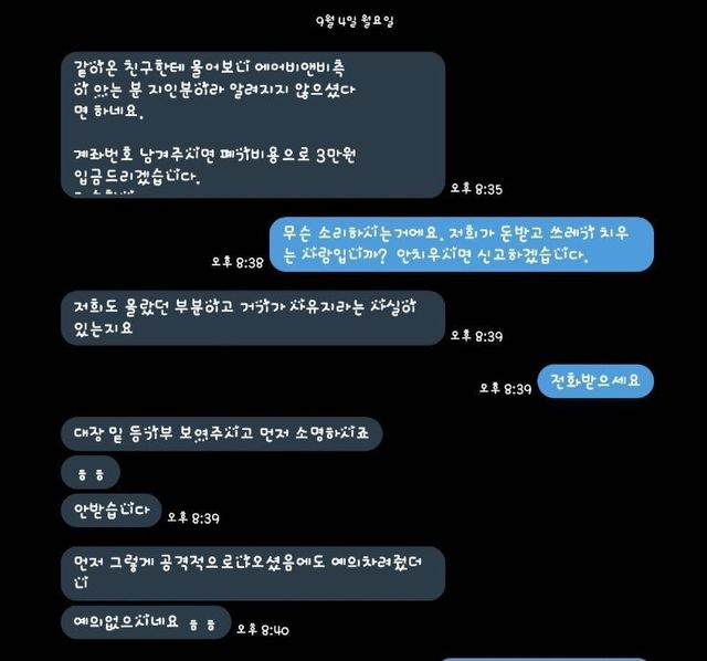그러자 B씨는 에어비앤비 주인을 알려줄 수 없다며 "계좌번호 남겨주면 폐기 비용으로 3만 원 입금하겠다. 죄송하다"고 메시지를 보냈다.