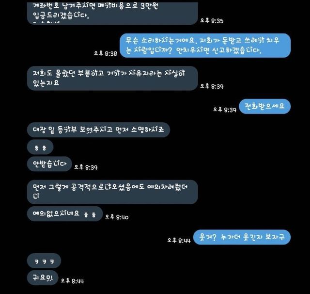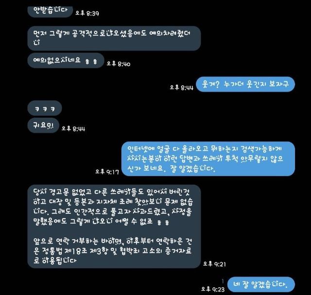 또 "앞으로 연락은 거부하며, 이후부터 연락해 온 건 정보통신망법 제18조 제3항 및 협박죄 고소의 증거자료로 이용된다"고 법을 운운하며 경고했다.