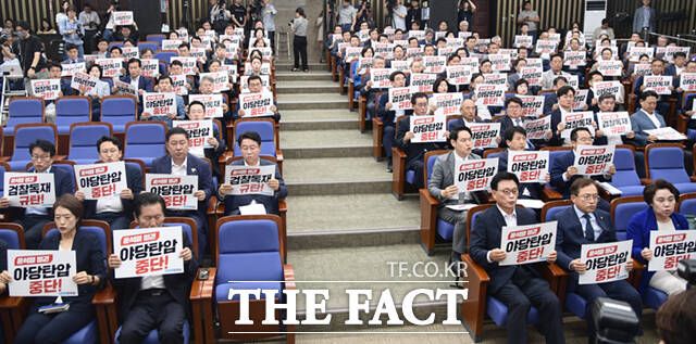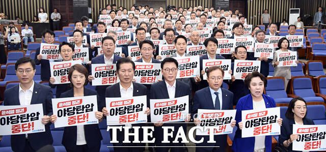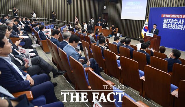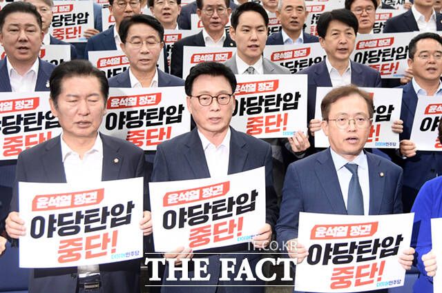 [더팩트ㅣ국회=이새롬 기자] 이재명 더불어민주당 대표의 여섯번 째 검찰 소환을 앞둔 12일 오전 서울 여의도 국회에서 열린 민주당 의원총회에서 박광온 원내대표를 비롯한 의원들이 야당 탄압 중단 피켓을 든 채 구호를 외치고 있다.