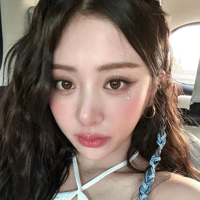화려한 색조 메이크업이 잘 어울리는 허윤진! 아이라인을 위로 길게 빼 캣츠아이를 연출했어요. 짙은 브라운톤 섀도우로 아이라인 경계를 풀어주었네요. 그녀의 트레이드마크는 애교살 메이크업. 애교살 라인에 확실하게 음영을 주고 쉬머한 샴페인 골드빛 섀도우로 중앙을 밝혀주었네요. 오버 블러립 메이크업도 요즘 트렌드.