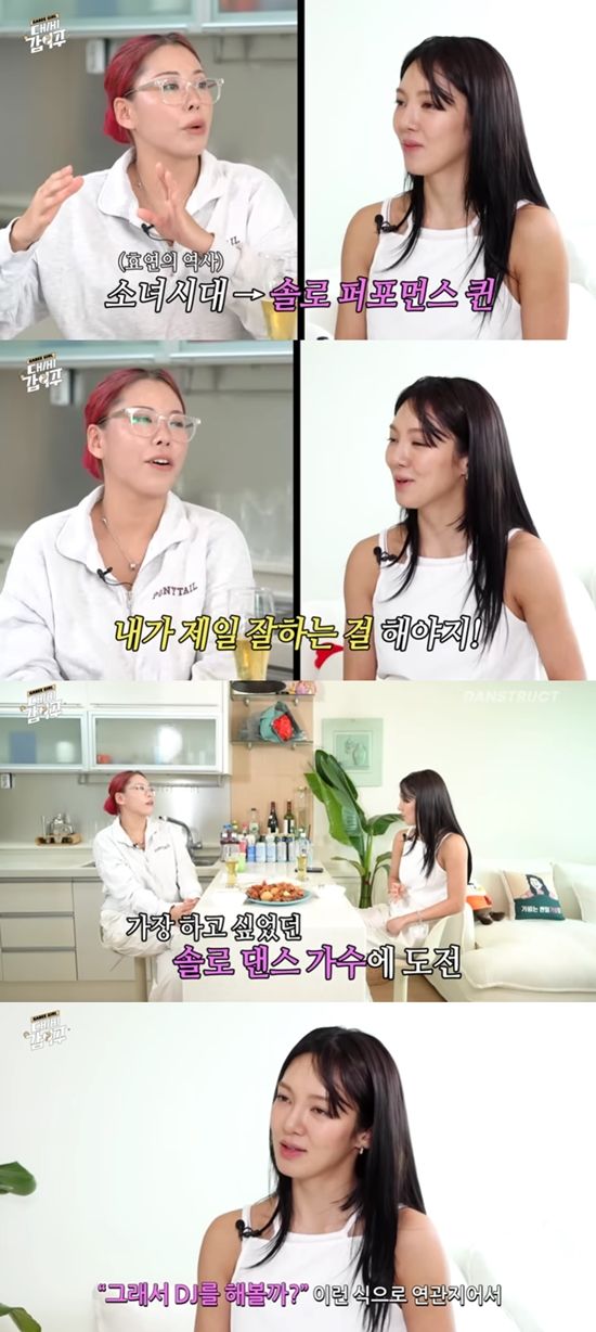 효연은 "소녀시대를 하면서 굉장히 많은 생각을 했다. 자식은 안 시켜야지. 그리고 이거 그만두고 뭐하지 싶었다. 주변에서 사업하라고 해서 의류, 액세서리 사업도 생각했다"면서 "결국 마음이 차분해질 때 다시 생각해 보니까 제일 잘하는 걸 해야겠더라. 그래서 솔로 댄스 가수로 다양한 음악 장르를 해보고 그중에서도 하우스 장르를 좋아했다. 이 장르는 DJ랑 연관돼서 DJ도 하게 된 것"이라고 설명했다.