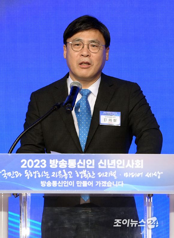 '2023 방송통신인 신년인사회'가 '국민과 동행하는 자유롭고 행복한 디지털·미디어 세상'을 주제로 18일 오후 서울 영등포구 63컨벤션센터 그랜드볼룸에서 열린 가운데 김의철 한국방송협회장이 개회사를 하고 있다. [사진=정소희 기자]