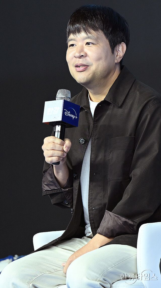 김상철 감독이 2일 오전 서울 종로구 동대문 JW메리어트호텔에서 열린 디즈니플러스 드라마 ‘한강’ 제작발표회에 참석해 취재진의 질문에 답하고 있다.