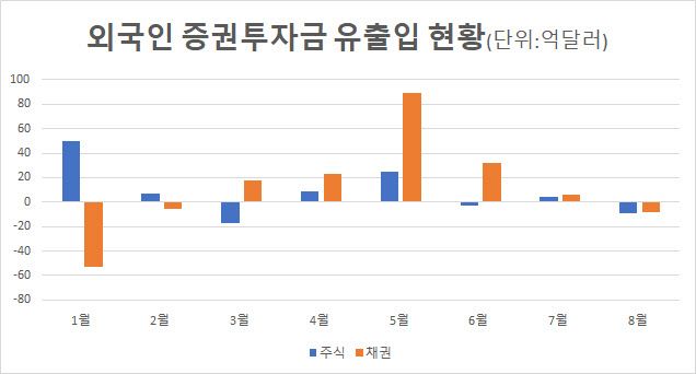 12일 한국은행이 발간한 ‘8월 이후 국제금융·외환시장 동향’에 따르면 외국인은 국내 증권에서 자금을 17억달러 순유출했다. 외국인들은 올 1월 3억4000만달러 순유출 이후 6개월간 순유입세를 지속하다 7개월 만에 순유출로 전환했다. 작년 12월 24억2000만달러 순유출 이후 8개월 만에 가장 큰 규모로 자금이 빠져나간 것이다.