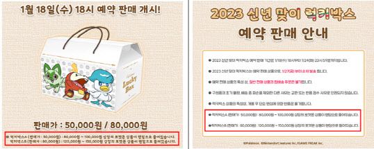 12일 공정거래위원회에 따르면 포켓몬코리아는 지난 1월 자사의 사이버몰 ‘포켓몬스토어’에서 ‘2023 신년맞이 럭키박스’라는 이름의 랜덤박스를 판매하면서 랜덤박스 후보상품(83개)에 대한 상품명, 제조국 등의 정보를 제공하지 않았다.