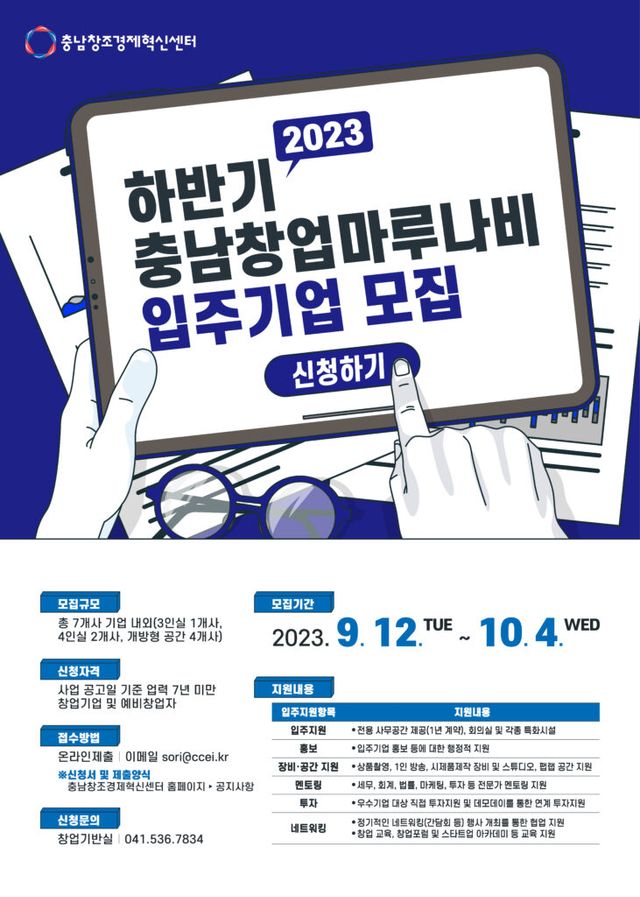 충남창조경제혁신센터(이하 충남센터)는 10월 4일까지 2023년 충남창업마루나비 입주기업을 모집한다고 밝혔다.