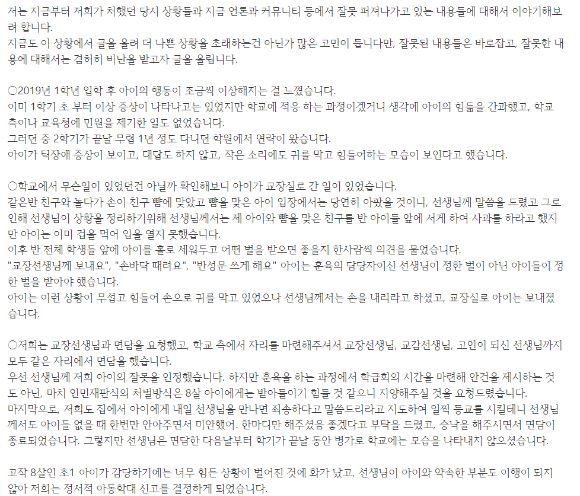 또 "아이에게 선생님께 죄송하다고 말씀드리라고 지도할 테니, 선생님께서도 한 번만 안아주면서 '미안했어' 한마디만 해주셨음. 좋겠다고 부탁을 드렸다. 그렇지만 선생님은 면담한 다음 날부터 학기가 끝날 동안 병가로 모습을 나타내지 않으셨다"라고 주장했다.