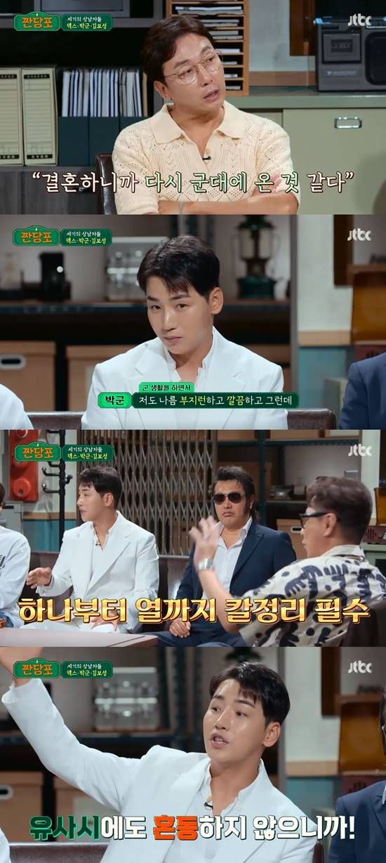 박군은 단칼에 "지금이 더 행복하다"라고 대답했다. 이에 탁재훈이 "근데 결혼하니까 다시 군대에 온 것 같다고 이야기했다더라"라고 물어봐 호기심을 자극했다.