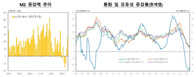 M2는 전년동월비(원계열 기준)로 보면 2.5% 증가했다. 전월(2.2%)보다 증가폭이 확대됐다. M2는 2021년 12월 이후 18개월 연속 증가세가 둔화되는 흐름을 보였으나 19개월 만에 증가폭 확대로 전환됐다.