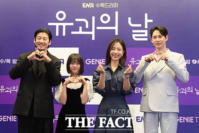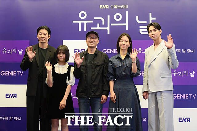 [더팩트ㅣ서예원 인턴기자] 배우 윤계상과 유나, 박유영 감독, 김신록, 박성훈(왼쪽부터)이 13일 오전 서울 마포구 스탠포드호텔 서울에서 열린 ENA 수목드라마 '유괴의 날' 제작발표회에 참석해 포즈를 취하고 있다.