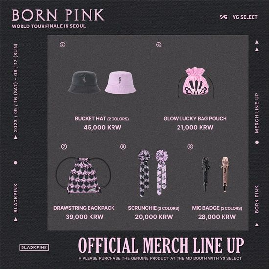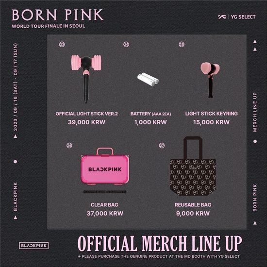 엔터테인먼트 인프라 및 IP 사업 전문기업 YG PLUS는 13일 블랙핑크 월드투어 '본 핑크' 서울 피날레 콘서트 MD 라인업을 공개했다.