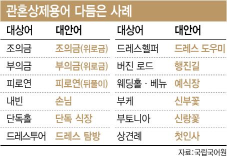 국립국어원은 지난해 관혼상제 49개 용어(관례 용어 2개, 혼례 용어 22개, 상례 용어 22개, 제례 용어 3개)에 대한 대안어를 마련하기도 했다. 국립국어원 측은 “전통을 존중하면서도 언어 표현 때문에 발생할 수 있는 세대나 분야 간 갈등을 방지하는 차원에서 기존 한자 용어와 새로운 쉬운 용어가 공존하도록 했다”며 “또 굳이 쓰지 않아도 될 외래 용어나 거의 쓰지 않아 뜻을 알기 어려운 일부 한자어를 쉬운 우리말로 바꿨다”고 했다.