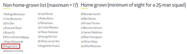 작별이 예상됐던 요리스가 NON 홈그로운 17인에 포함됐다. 토트넘은 오랜 기간 골문을 든든히 책임졌던 요리스와 작별하기 직전이었다. 요리스는 지난 2012년 리옹을 떠나 토트넘에 합류한 다음 지난 시즌까지 '넘버 원' 수문장으로 활약했다. 토트넘 소속 통산 기록은 447경기 508실점 클린시트(무실점) 151회다.