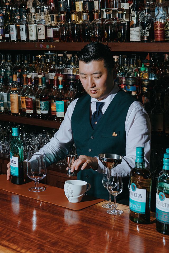“병이 조금 독특하게 생겼죠.” 김진환 바텐더가 싱글톤 12년 병을 바라보며 말했다. 그는 2018년 ‘바텐더계의 월드컵’이라 불리는 ‘월드클래스’ 출전권을 놓고 열린 한국 국가대표 선발전에서 우승했다. 이때 만든 칵테일이 ‘더 마에스트로’다. 베토벤에게서 영감받은 칵테일로 싱글톤 12년을 썼다. 더 마에스트로는 지금도 베토벤 얼굴이 조각된 잔에 담긴다.“싱글톤 12년의 가장 큰 특징은 청사과 향입니다. 싱글 몰트위스키 중에서 사과 향이 나는 건 드물어요. 대중적인 맛은 아니지만 그만큼 매력적이죠.” 싱글톤 라인업은 12년, 15년, 18년으로 구성된다. 숙성 연도 뒤에는 ‘글렌오드’ ‘글렌듈란’ ‘더프타운’이라는 이름이 붙는다. 각 명칭은 싱글톤을 만드는 세 증류소의 이름으로 각각 아시아, 유럽, 미주에만 판매됐지만, 지금은 한국에서도 더프타운을 구할 수 있다. 김진환 대표가 이날 소개한 것도 싱글톤 12년 더프타운이다. ‘더 마에스트로’는 싱글톤 12년과 커피 에센스, 레드와인 슈럽, 체리 증류주인 키르슈바서를 조합해 완성된다. 훌륭한 칵테일이지만 일반인이 이 모든 재료를 구비해놓기는 쉽지 않다.