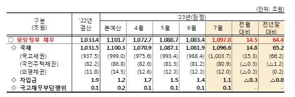 지난 7월 말 기준 국가 채무(중앙정부 채무)는 1097조8000억 원으로 한 달 전인 6월 말보다 14조5000억 원 증가했다.