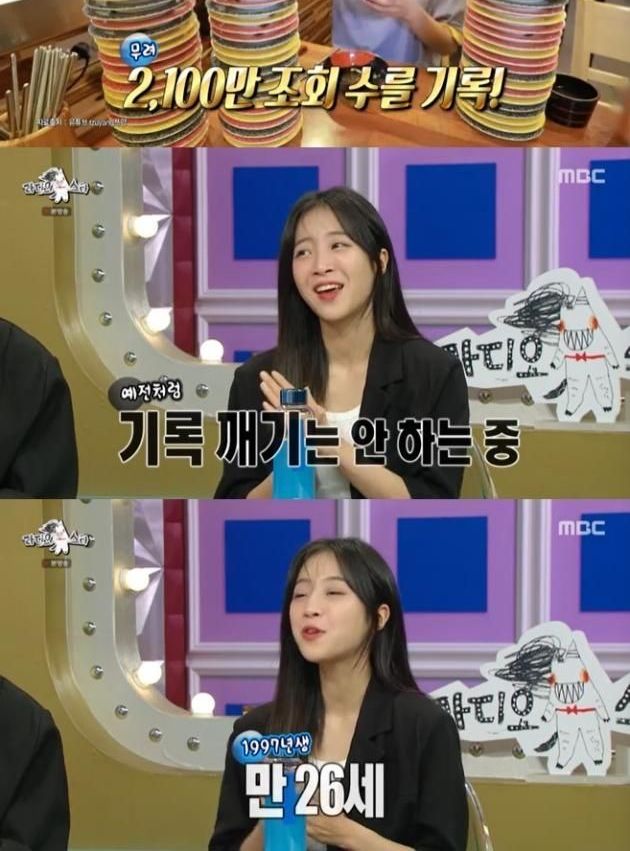 그러자 MC 김구라가 "초밥은 몇 접시 먹냐"라며 궁금해 했다. 쯔양은 "항상 100접시 이상 먹는다. 회전 초밥을 좋아한다. 한 접시에 2개씩 있으니까 초밥 200개는 꼭 먹는다"라고 알려 놀라움을 줬다.