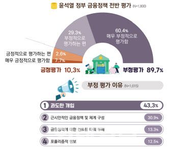 [이데일리 정두리 기자] 금융종사자 10명 중 9명이 지난 1년간 실행된 윤석열 정부의 금융정책에 대해 부정적인 것으로 조사됐다. 부정 평가 이유로는 ‘과도한 개입’ 때문이라는 응답이 가장 많은 것으로 나타났다.